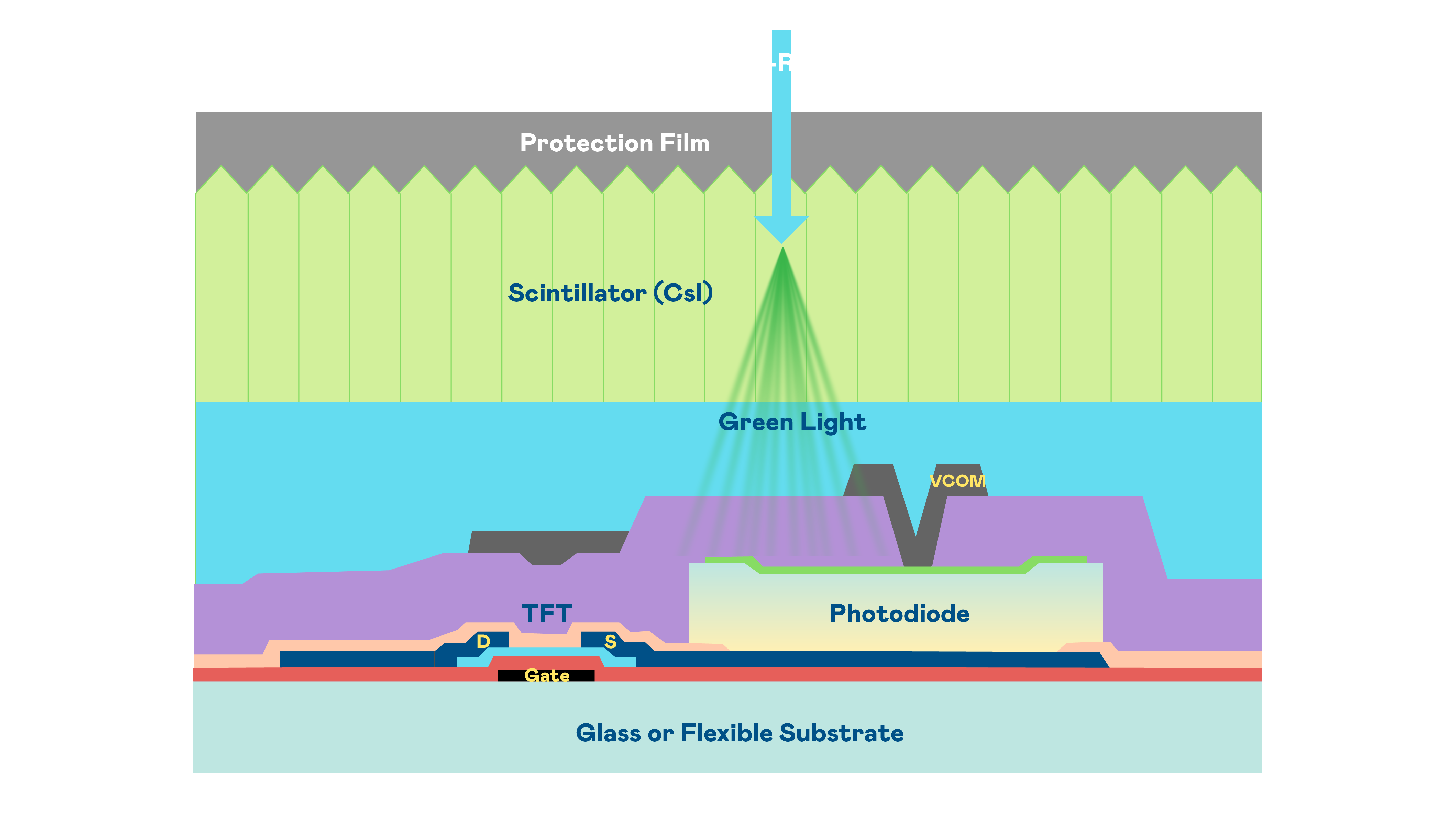 金年会的X光影像感测阵列使用薄膜电晶体 (TFT) 作为每个像素的读取开关,搭配光电二极体(Photodiode)的光电转换元件,用以感测X光影像讯号。
